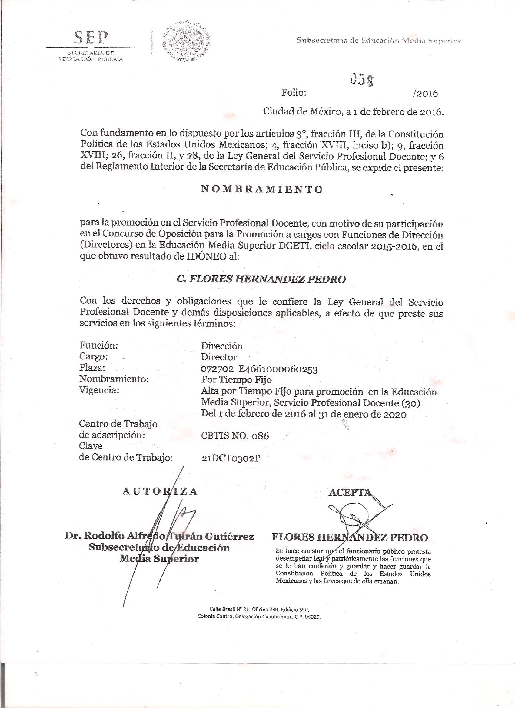 - 2016 (22 de abril a la fecha como Director del CBTis No. 86 de acuerdo al nombramiento autorizado por el Dr. Rodolfo Alfredo Tuirán Gutiérrez, Subsecretario de Educación Media Superior , derivado del concurso de oposición para la Promoción a cargo con Funciones de Dirección (Directores) , en la Educación Media Superior de la DGETI, ciclo escolar 2015-2016 en el que obtuve el resultado de idóneo, con vigencia del 01 de febrero del 2016 al 31 de enero de 2020.